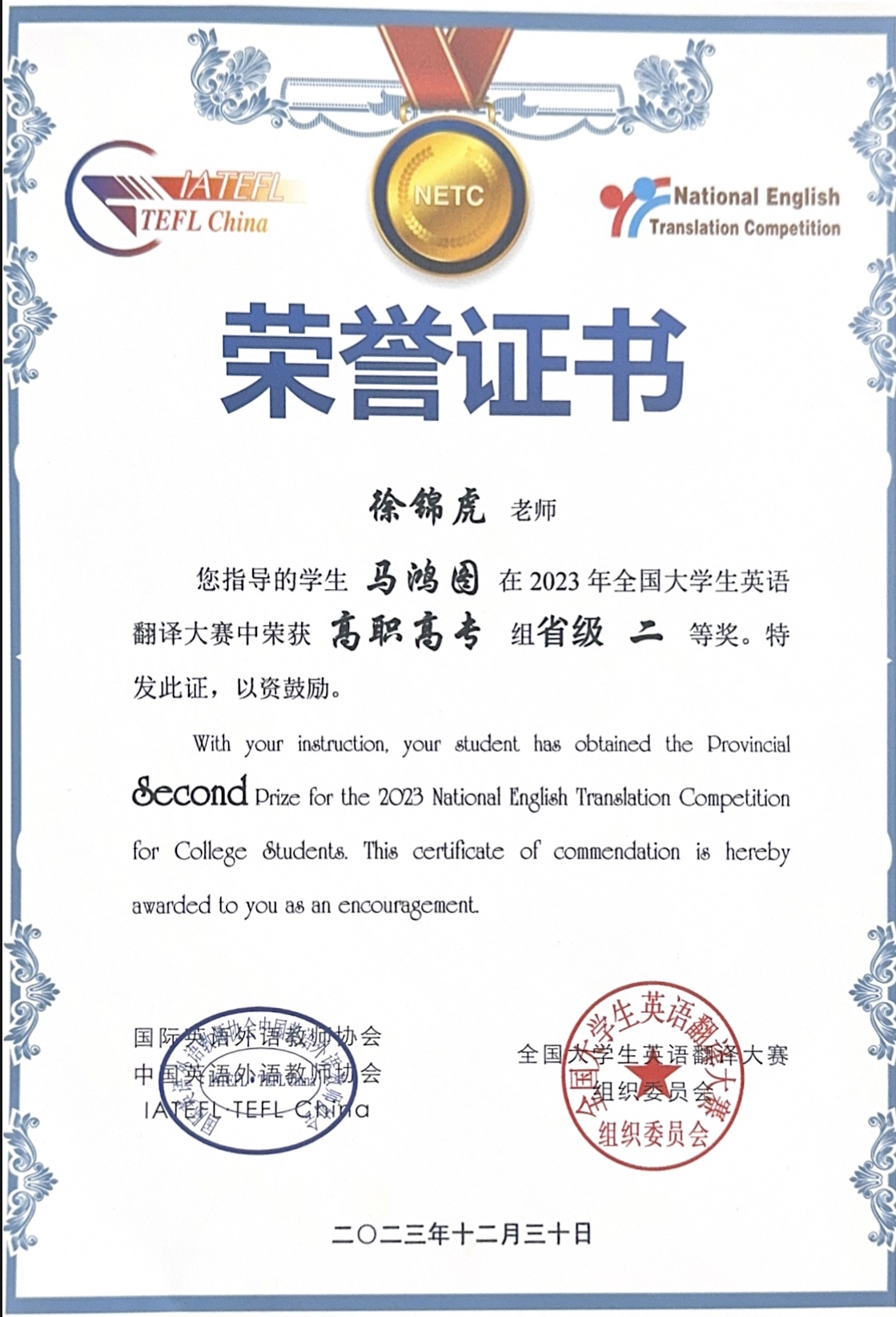 近日,公司人工智能专业员工马鸿图凭借扎实的专业素养和良好的创新能力,在徐锦虎老师的指导下,荣获中国老员工计算机知识竞赛全国决赛一等奖、全国老员工英语翻译大赛高职高专组省级二等奖!